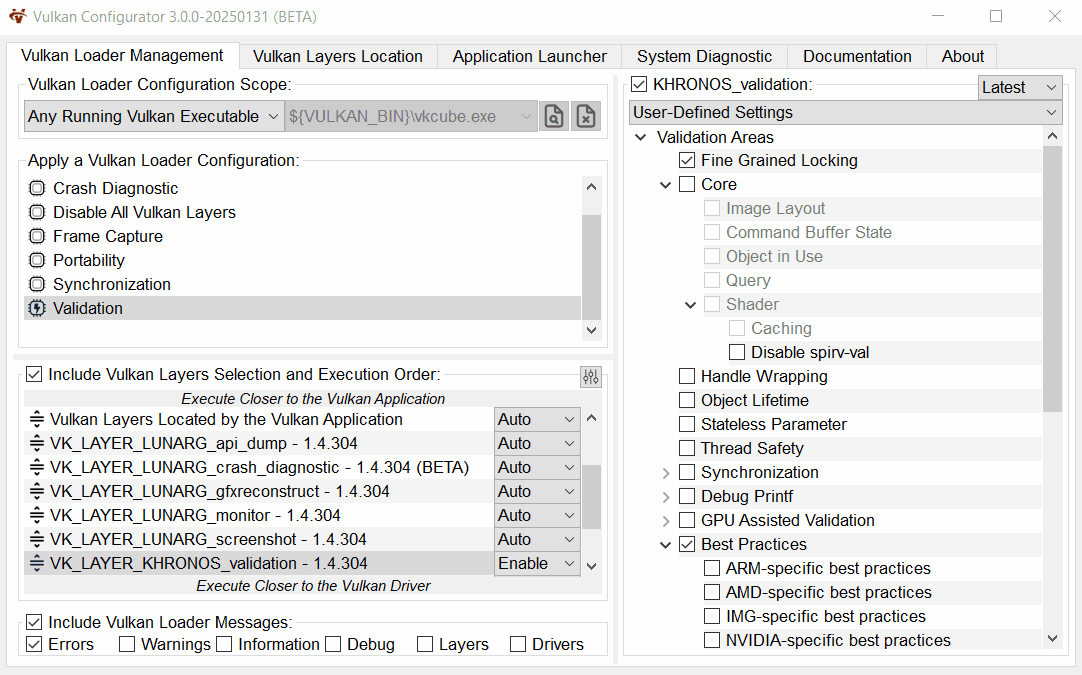 Vulkan Layers Settings: Per-layer settings loaded by each layer library and stored in the vk_layer_settings.txt file. This file is located either next to the Vulkan application executable or set globally and applied to all Vulkan applications thanks to Vulkan Configurator. These settings are described here for VK_LAYER_KHRONOS_validation and here for other layers created by LunarG.