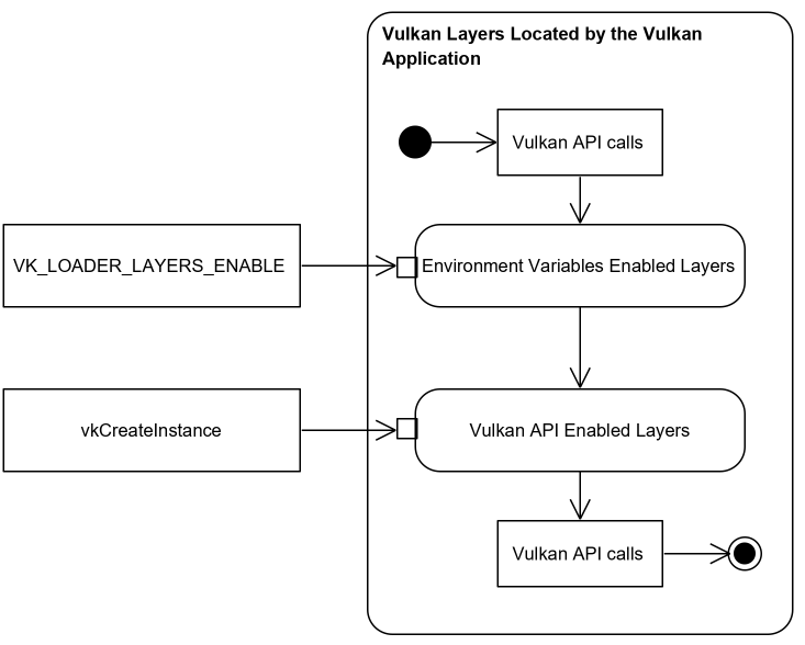 All layers may are not be located by Vulkan Configurator. Some may be located and enabled by the Vulkan application at launch time using VK_ADD_LAYER_PATH environment variable and they will be executed within the "Vulkan Layers Located by Vulkan Application" block set in Vulkan Configurator in the layers order specified in VK_LOADER_LAYERS_ENABLES and vkCreateInstance arguments represented in the following diagram:
