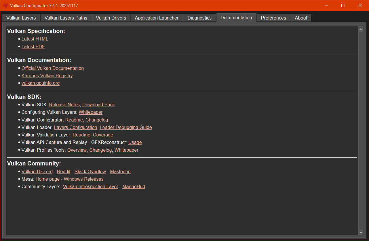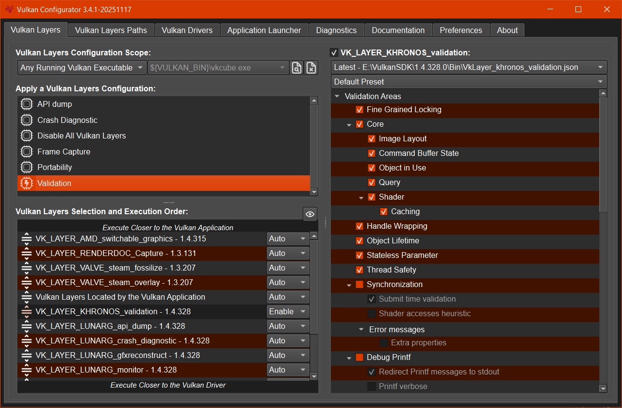 Part of the Vulkan SDK, Vulkan Configurator is a tool designed to help Vulkan application developers configuring their Vulkan system: The Vulkan Loader, Vulkan Layers and Vulkan drivers.
