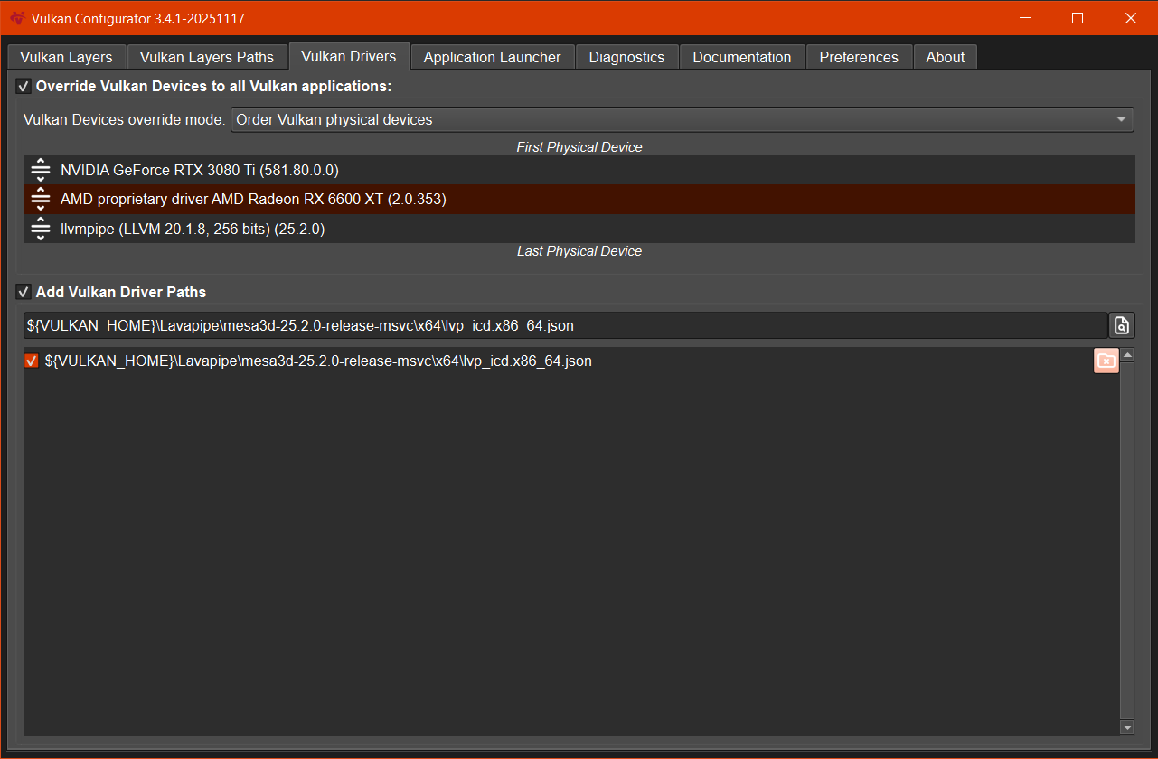 This tab allows adding Vulkan drivers but also either sorting or forcing Vulkan physical devices to all Vulkan applications.
