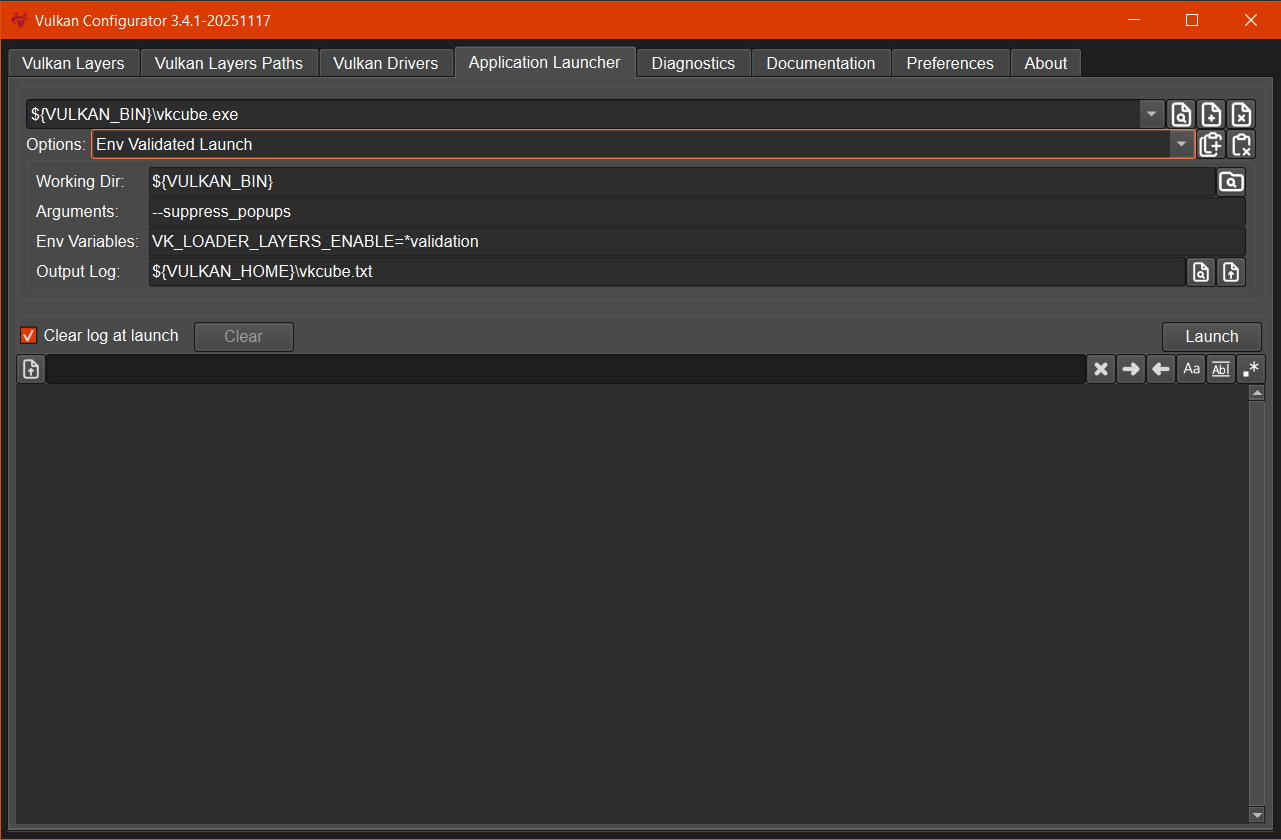 It's a graphical user interface (GUI) that may be launched from the console using vkconfig-gui and a command line tool vkconfig --gui. Vulkan Configurator may be used with command line arguments to configure Vulkan Loader. Use vkconfig --help in the console for more information.